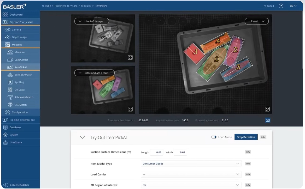 ItemPickAI uses the data provided by 3D cameras to reliably capture the scene and perform precise point cloud analysis: Integration takes place via standardized interfaces such as GenICam or GigE Vision as well as the pylon SDK.